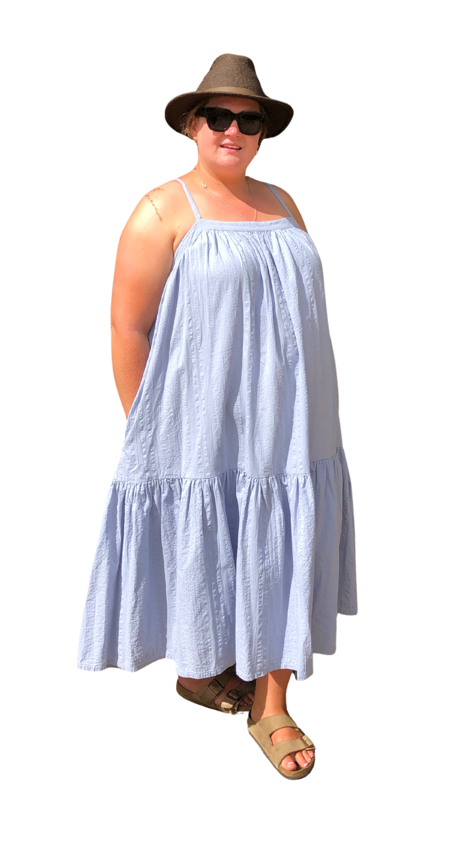 Your breezy best friend for summer days and carefree nights, bringing easy elegance with minimal effort. Crafted from soft organic cotton in a dreamy powder blue, this relaxed tiered midi drapes effortlessly with every step. The ultra-lightweight fabric and loose silhouette make it the ultimate throw-on-and-feel-fabulous piece. Perfect for brunch parties, day events, coastal escapes and weekends away.